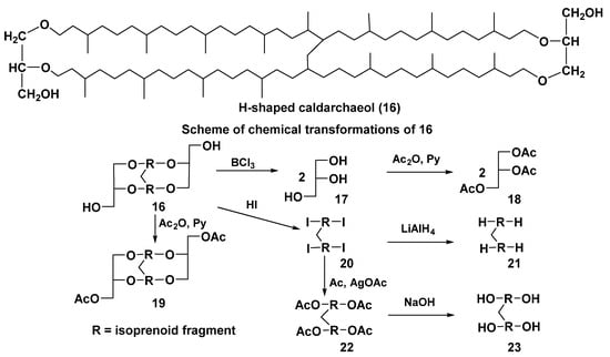 In addition to intrachain cyclization, leading to the formation of five- and six-membered rings, interchain conversions also take place in the processes of biosynthesis of bipolar compounds. Actually, the so-called H-shaped caldarchaeol (16) (Figure 5) from the hyperthermophilic methanogenic archaeon Methanothermus fervidus [49] is obviously a result of the interaction between a methyl group in the middle of one isoprenoid moiety and a double bond in another chain. Indeed, it has a molecular weight of 2 units less than caldarchaeol (3), and the 1H NMR spectrum of 16 lacks a three-proton signal of one methyl group and contains signals of 15 methyl groups instead of 16 compared to that of 3.
