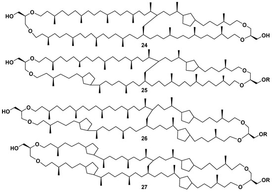 Compounds 24–27, found in cultured thermoacidophilic archaeon Candidatus “Aciduliprofundum boonei” from deep-sea hydrothermal vents, proved to be cyclopentane-containing lipids belonging to the same structural series (Figure 6) [50].