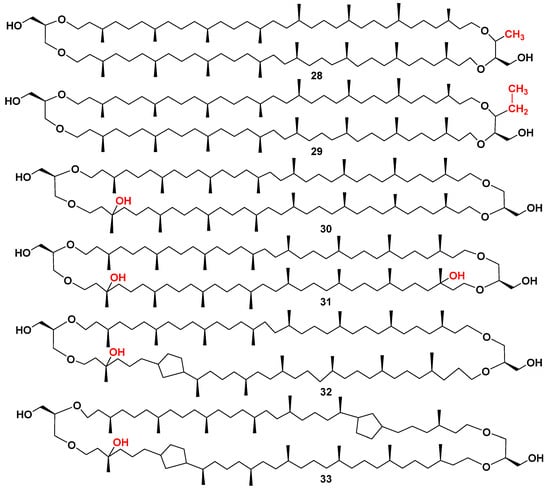 Sometime later, the corresponding bipolar metabolites containing only one terminal glycerol residue and another terminus, represented by butanetriol or pentanetriol fragments, as in 28 and 29 (Figure 7), were detected in extracts of Methanomassiliicoccus luminyensis, only cultured archaeal methanogenic species of the order Methanomassilicoccales. Their structural analysis was facilitated by HPLC/MS [51]. The appearance of 1,2,3-butanetriol or 1,2,3-pentanetriol fragments in archaeal bipolar lipids was suggested to be adaptive traits of some methanogenic archaea to energy-limited environments [52].