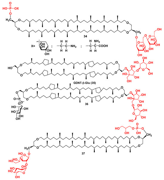 Until now, there were limited data concerning the exact structures of individual archaeal intact bipolar lipids, determined by NMR spectroscopy and/or confirmed by organic synthesis. Recently, the major membrane lipid of thermophilic archaea, belonging to the genus Sulfolobus, was shown to be a tetracyclopentane derivative, so-called GDNT-β-Glu (35), containing a glucopyranose residue attached to the calditol (Figure 8). Its structure was determined by Scholte et al. after the isolation of 35 and analyses of its NMR and MS spectra [59]. They studied membrane lipids from S. solfataricus, S. acidocaldarius, and S. metallicus, cultured at 85 °C, 70 °C, and 75–80 °C, respectively. In each of these cases, mixtures of related compounds, having from 4 to 5–7 cyclopentane rings were obtained. At that, 65% of the derivative 35 in a fraction of intact lipid, containing 4 cyclopentane fragments, was found from S. metallicus. This fraction was chosen for purification and further structural study on this compound.