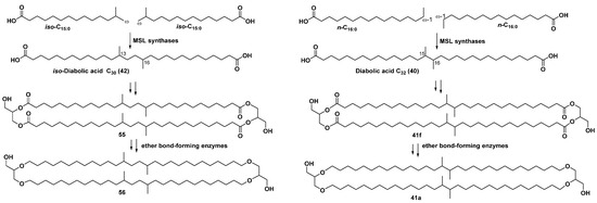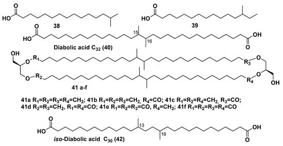 Another group of branched FAs incorporates the long-chain branched dicarboxylic acids, which were found as constituents of membrane metabolites of hyperthermophilic members belonging to the order Thermotogales, one of the early lineages in the domain of bacteria. Diabolic acid (40) and as well as its homologs and derivatives are long-chain acids, containing demethylated fragments with two adjacent methyl groups in the central parts of their chains, which combine into this group. Structurally, they were identified as an intrinsic part of phospholipids isolated from the bacteria Butyrivibrio spp. [83]. The type of bipolar lipids, based on 40 and related compounds, was identified by Sinninghe Damste’s group using HPLC/MS in bacteria belonging to the order Thermotogales with an upper growth limit of about 90 °C. Core lipids with diabolic acid residues in their hydrophobic chains were identified in the membranes of nine species of this ancient lineage of bacteria. Since Thermotogales species are assumed to have arisen early during the evolution of life on Earth (that was based on consideration of their position on the phylogenetic tree of life), obtained data on their FAs compositions suggested that the ability to produce both ether- and ester-containing bipolar lipids (general formula 41) also appeared in the early stages of microbial evolution [84].