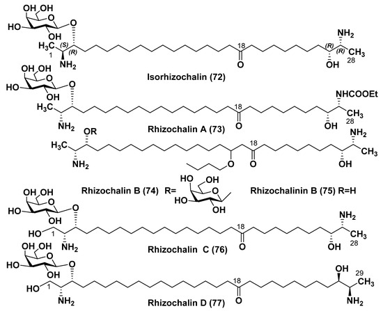 - Makarieva, T.N.; Guzii, A.G.; Denisenko, V.A.; Dmitrenok, P.S.; Santalova, E.A.; Pokanevich, E.V.; Molinski, T.F.; Stonik, V.A. Rhizochalin A, a novel two-headed sphingolipid from the sponge Rhizochalina incrustata. J. Nat. Prod. 2005, 68, 255–257. [Google Scholar] [CrossRef]