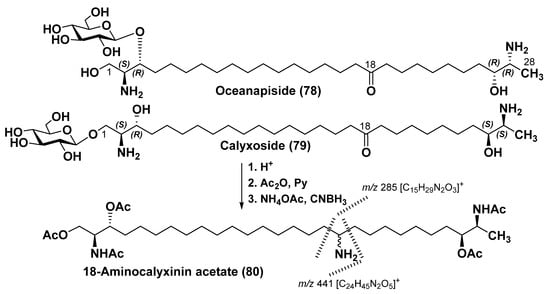 - Nicholas, G.M.; Hong, T.W.; Molinski, T.F.; Lerch, M.L.; Cancilla, M.T.; Lebrilla, C.B. Oceanapiside, an antifungal bis-α,ω-amino alcohol glycoside from the marine sponge Oceanapia phillipensis. J. Nat. Prod. 1999, 62, 1678–1681. [Google Scholar] [CrossRef]