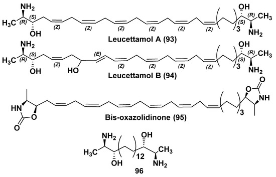 - Kong, F.; Faulkner, D.J. Leucettamols A and B, two antimicrobial lipids from the calcareous sponge Leucetta microraphis. J. Org. Chem. 1993, 58, 970–971. [Google Scholar] [CrossRef]