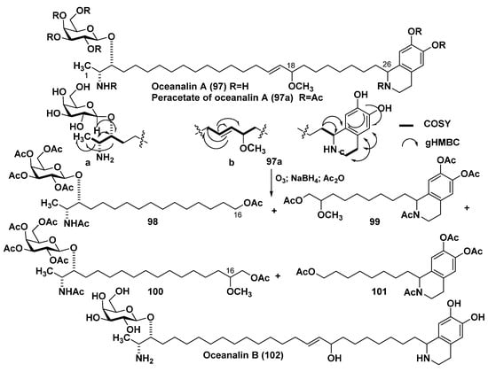 - Makarieva, T.N.; Ivanchina, N.V.; Dmitrenok, P.S.; Guzii, A.G.; Stonik, V.A.; Dalisay, D.S.; Molinski, T.F. Oceanalin B, a hybrid α,ω-bifunctionalized sphingoid tetrahydroisoquinoline β-glycoside from the marine sponge Oceanapia sp. Mar. Drugs 2021, 19, 635. [Google Scholar] [CrossRef] [PubMed]