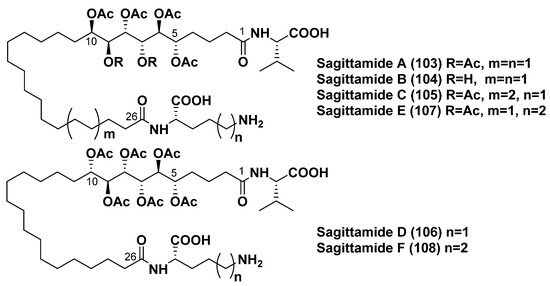 - Lievens, S.C.; Molinski, T.F. Sagittamides A and B. Polyacetoxy long-chain acyl amino acids from a Didemnid Ascidian. Org. Lett. 2005, 7, 2281–2284. [Google Scholar] [CrossRef]