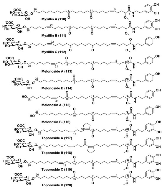 - Guzii, A.G.; Makarieva, T.N.; Fedorov, S.N.; Menshov, A.S.; Denisenko, V.A.; Popov, R.S.; Iarotsckaia, V.V.; Kim, N.Y.; Stonik, V.A. Toporosides A and B, cyclopentenyl-containing ω-glycosylated fatty acid amides, and toporosides C and D from the Northwestern Pacific marine sponge Stelodoryx toporoki. J. Nat. Prod. 2022, 86, 1186–1191. [Google Scholar] [CrossRef] [PubMed]