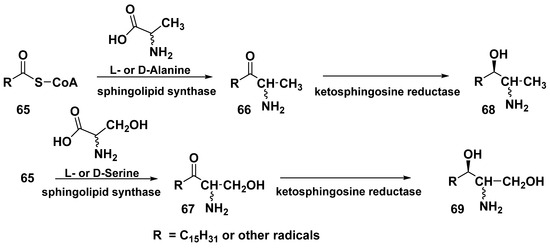 - Harrison, P.J.; Dunn, T.M.; Campopiano, D.J. Sphingolipid biosynthesis in man and microbes. Nat. Prod. Rep. 2018, 35, 921–954. [Google Scholar] [CrossRef]