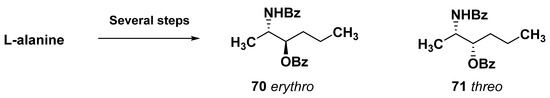 - Humbert, A.; Plé, K.; Harakat, D.; Martinez, A.; Haudrechy, A. A further contribution to the study of sagittamide A: Synthesis of a pivotal intermediate belonging to a rare L-series. Molecules 2012, 17, 7709–7721. [Google Scholar] [CrossRef]