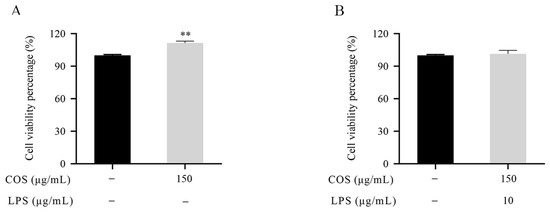 Effect of COS and LPS on BMEC viability. (A) Viability of BMECs treated with 150 μg/mL COS for 36 h. (B) Viability of BMECs pretreated with 150 μg/mL COS for 12 h and co-treated with 10 μg/mL LPS for an additional 24 h. Data are presented as the mean ± standard deviation (SD) (n = 3). ** p < 0.01 indicates a statistically significant difference.