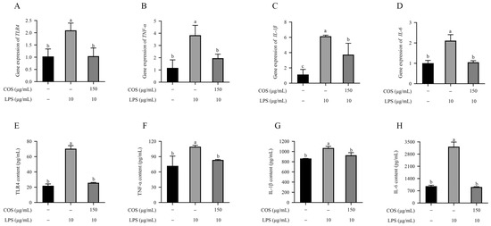Compared with the control group, TLR4, TNF-α, IL-1β, and IL-6 mRNA expression levels were significantly increased in BMECs treated with 10 μg/mL LPS (p < 0.05) (Figure 2A–D). In contrast, pretreatment with 150 μg/mL COS effectively significantly reversed this trend (p < 0.05). Consistently, in Figure 2E–H, the enzyme-linked immunosorbent assay (ELISA) results confirmed that COS pretreatment significantly decreased the expression of TLR4, TNF-α, IL-1β, and IL-6 induced by LPS (p < 0.05). The above findings suggested that COS potentially mitigate the inflammatory response by restraining inflammatory cytokines.