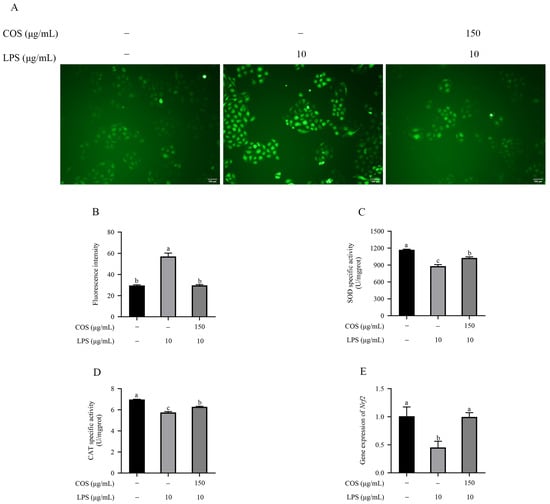 Reactive oxygen species (ROS) levels were assessed using an immunofluorescence microscopy and analyzed with Image J. In Figure 3A,B, the fluorescence intensity of the LPS group was significantly increased compared with the control group (p < 0.05). However, the fluorescence intensity of ROS in the COS with LPS group was markedly reduced compared to the LPS group (p < 0.05). Therefore, the results suggest that COS might protect BMECs against ROS oxidative damage.
