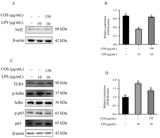 In Figure 4A,B, Nrf2 expression in the LPS group markedly reduced compared with that of the control group. In contrast, Nrf2 expression was up-regulated in the COS with LPS group (p < 0.05). As demonstrated in Figure 4C–F, TLR4, p-IκBα/IκBα, and p-p65/p65 levels dramatically increased after LPS stimulation. However, TLR4, p-IκBα/IκBα, and p-p65/p65 levels in the COS with LPS group were reduced compared with the LPS group (p < 0.05). These results suggested that COS potentially alleviates oxidative stress and the inflammatory response stimulated by LPS in BMECs though Nrf2 and the TLR4/NF-κB signaling pathway.