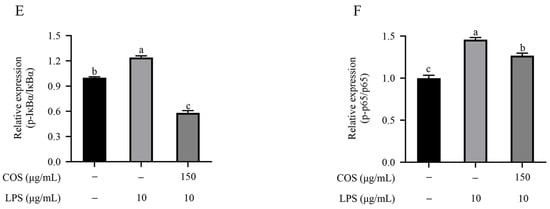COS alleviated oxidative stress and inflammatory response induced by LPS by regulating Nrf2 and the TLR4/NF-κB signaling pathway. (A) Western blot (WB) images of Nrf2. (B) Quantification analysis of Nrf2 expression. (C) WB images of TLR4, p-IκBα, IκBα, p-p65, and p65. The quantification analysis of (D) TLR4, (E) p-IκBα/IκBα, and (F) p-p65/p65 expression. Data are presented as the mean ± SD (n = 3). Groups with different superscript letters are considered statistically different (p < 0.05).