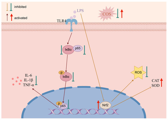 This research demonstrates that COS inhibited TLR4 expression and IκBα and p65 phosphorylation, thereby preventing the secretion of downstream inflammatory cytokines, such as TNF-α, IL-1β, and IL-6, in LPS-induced BMECs. COS decreased ROS production and increased SOD and CAT content in BMECs stimulated by LPS by activating the Nrf2 signaling pathway. In summary, COS potentially regulate the TLR4/NF-κB and Nrf2 signaling pathway to alleviate the inflammatory response and oxidative stress, respectively (Figure 5).
