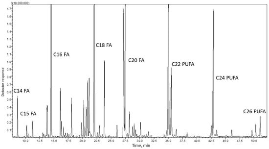 Since some Cnidaria species (especially jellyfish) contain only ca. 0.2% total lipids (TLs), it is better to use the cost-effective method proposed by [] for lipid extraction. For the isolation of TLs from stony corals, the extraction of crashed corals, instead of the preliminary isolation of soft tissues by air spraying, is a much more efficient approach []. For the preparation of FA methyl esters (FAMEs), the use of acid reagents (5% HCl or 1–2% sulfuric acid in methanol), 50 °C overnight or 80 °C for 90 min, is more preferable [] because the preliminary saponification or transesterification with NaOCH3 in methanol induces the decomposition and isomerization of octadecapentaenoic acid 18:5n3 into four isomers [,]. The methyl ester of octadecapentaenoic acid 18:5n3 on GC, separated on a Supelcowax 10 polar column, has an equivalent chain length (ECL) of 20.22, while isomers run much more latter, with ECL of 20.48, 20.88 (main peak), and 21.19. Accordingly, instead of the peak of 18:5n3 with an ECL of 20.22, which is located close to (even overlaps) the peak of 20:1n9, one can see artifact peaks with an ECL of 20.88. Identifying 18:5n3 on a non-polar column with 5% phenyl silicon such as SLB-5 or one similar, where the ECL is equal to 17.55, is much easier. For the identification of marine-derived FAs, FAME standard mixtures such as Supelco 37 are often used, but these do not contain the usual marine FAMEs such as 18:1n7, 18:4n3, 20:4n3, 22:5n3, and 22:5n6. Moreover, marine organisms may have PUFAs with C24 and C26 and even longer carbon chains. There are reports about the presence of elaidic acid (18:1n9 trans), which is not characteristic of marine samples. Besides the use of sophisticated equipment like GC–MS, there is a simple and convenient method of FAME identification carried out by the calculation of ECL values. It helps identify the most common and unusual FAs merely by comparing its own data with published tables of ECL values, e.g., in []. Moreover, it allows for the calculation or prediction of ECL for new FAs []. More details on ECL values for FAMEs on columns with different phases and their MS spectra are available at Chrombox.org []. For very-long-chain PUFAs with the carbon chains C24–C26, which are characteristic of the class Octocorallia, the analysis is preferably conducted under special conditions because these FAs have very long retention times (RTs). For example, on the common polar column Supelcowax 10 at 220 °C, the RT for the acids 22:6n3, 24:6n3, and 26:7n3 are 28.4, 48.1, and 86.7 min, respectively. On the non-polar column SLB-5ms with a temperature ramp of 170–280 °C (2°/min), the RT is quite moderate, <55 min, and the separation is good. An example of a chromatogram for total lipids in the jellyfish Rhopilema esculentum is shown in Figure 1.
