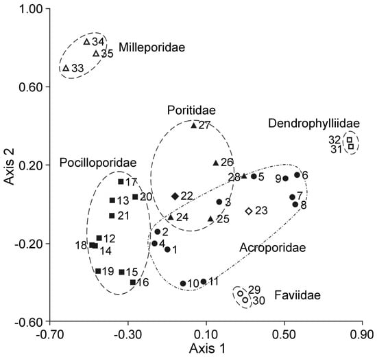 Multidimensional scale analysis performed using ten FAs selected as marker variables. Filled circles are for Acroporidae; filled squares for Pocilloporidae; filled triangles for Poritidae; open circles for Faviidae; open squares for Dendrophylliidae; filled rhombi for Pectiniidae; and open rhombi for Fungiidae. The plot is redrawn from [].