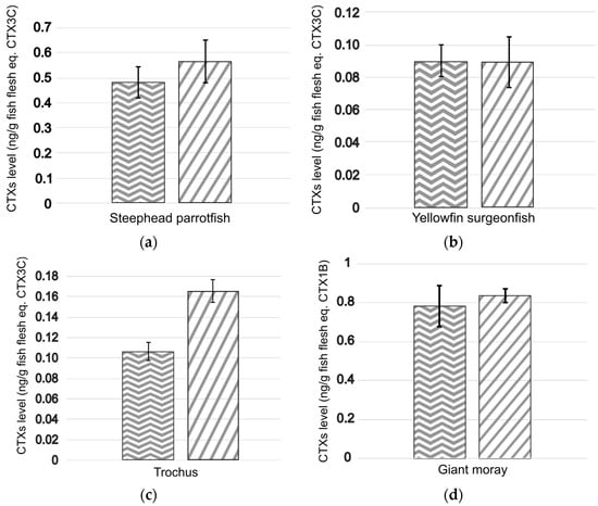 The results showed that the estimated CTX levels for carnivorous fish (likely to contain mostly polar CTXs) were broadly similar for both protocols, ranging from 0.075 ± 0.006 to 0.714 ± 0.103 and from 0.067 ± 0.004 to 0.836 ± 0.036 ng eq. CTX1B g−1 wet fish flesh for protocol #1 (n = 9) and the OP protocol (n = 6), respectively (Figure 2). Equivalent toxicities were also calculated for the two herbivorous fish samples (likely to contain mostly nonpolar CTXs), with CTX levels quantified at 0.48 ± 0.06 and 0.09 ± 0.01 ng CTX3C eq. g−1 wet fish flesh for protocol #1 (n = 9) and 0.57 ± 0.09 and 0.09 ± 0.02 ng CTX3C eq. g−1 wet fish flesh for the OP protocol (n = 6) in the steephead parrotfish Chlorurus microrhinos and yellowfin surgeonfish (Acanthurus xanthopterus) samples, respectively (Figure 2). However, regarding the trochus Tectus niloticus, a 1.6-fold increase in the CTX level measured was observed using the OP protocol (16.6 ± 1.1 ng CTX3C eq. g−1 wet flesh) compared to protocol #1 (10.6 ± 0.9 ng CTX3C eq. g−1 wet flesh) (Figure 2).