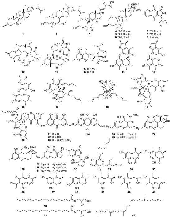 The chemical structures of compounds 1–44 isolated from Penicillium griseofulvum.