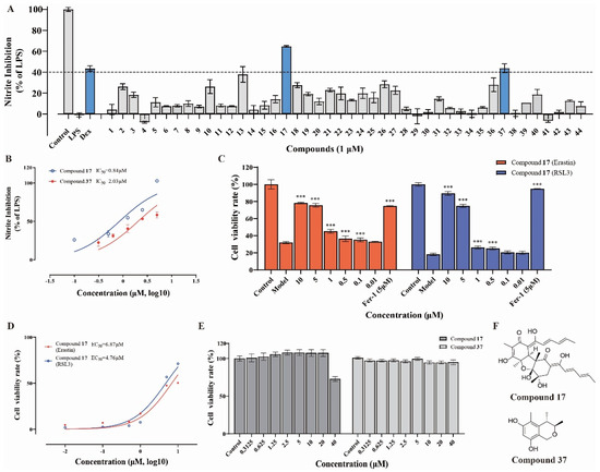 Identification of neuroprotective compounds through their anti-inflammatory and ferroptosis-inhibitory properties. (A) Evaluation of the anti-inflammatory potential of marine-derived compounds 1–44 in BV2 cells, highlighting the inhibitory effects on nitric oxide (NO) production. (B) Determination of IC50 values for isobisvertinol (17) and decarboxydihydrocitrinin (37), demonstrating their potency in inhibiting NO production, with 17 showing an IC50 of 0.84 μM and 37 an IC50 of 2.03 μM. (C) Visualization of the protective effects of 17 against ferroptosis triggered by Erastin and RSL3, comparing its efficacy to that of the positive control, Fer-1. (D) Assessment of the EC50 values for 17 in protecting against ferroptosis induced by RSL3 and Erastin, with EC50 values of 4.76 μM and 6.87 μM, respectively; (E) Analysis of the cytotoxicity profile of 17 and 37 at various concentrations, indicating no significant cytotoxicity within the tested range. (F) Presentation of the chemical structures of the compounds 17 and 37, which were identified as promising candidates for their neuroprotective properties. Data were expressed as mean ± SEM. *** p < 0.001 compared with the Model group.