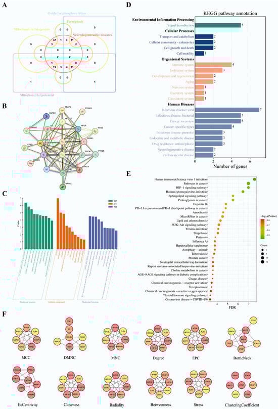 Functional enrichment. (A) Multivariate Venn diagram of isobisvertinol-disease/biofunction targets. (B) PPI network of targets with more than three intersections in the multivariate Venn diagram. (C) Functional enrichment cluster analysis of the top 10 GO terms in Biological Process (BP), Cellular Component (CC), and Molecular Function (MF). (D) Secondary classification annotation of KEGG. (E) Bubble chart of the top 30 enriched pathways. (F) CytoHubba algorithm results. Analysis of the PPI network data from STRING using Cytoscape, with hub gene identification performed using 12 algorithms included in cytoHubba, ultimately selecting the top 7 genes ranked by each algorithm’s scoring system as hub genes.