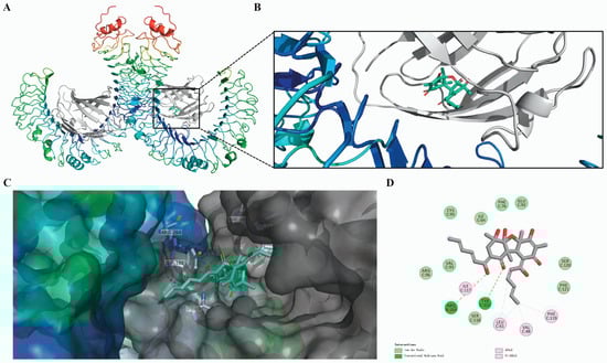 Molecular docking configuration of isobisvertinol (17) to the toll-like receptor 4 (TLR4)/myeloid differentiation protein-2 (MD-2) complex. (A) Molecular docking results of 17 and TLR4/MD-2 complex, the total view. (B,C) Side view of symmetrical dimer of the complex and 17 binding site in the crystal structure. (D) The detailed interaction view of TLR4/MD-2 pertinent amino acids residues with 17.
