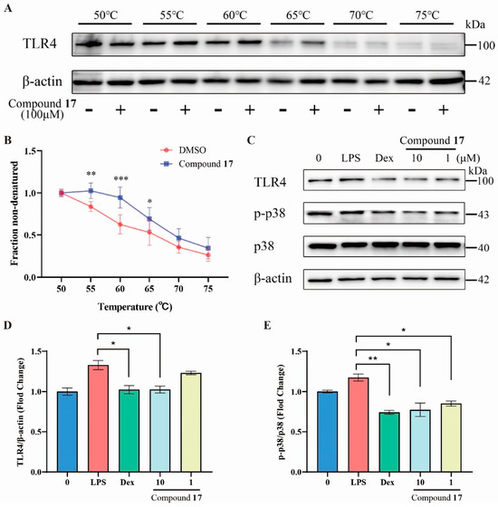 Cellular thermal shift assay is a technique used to detect the binding efficiency of drugs to their target proteins. The principle is that when proteins bind to drug molecules, they typically become more stable, leading to an increase in the protein’s melting temperature value [58]. As shown in Figure 5A,B, cellular thermal shift assay (CETSA) results indicate that isobisvertinol (17) enhances TLR4 protein thermostability upon heating from 50 °C to 75 °C, implicating TLR4 as a key target for isobisvertinol’s anti-inflammatory activities. Figure 5C–E shows that 17, at 10 μM and 1 μM, inhibits LPS-induced TLR4 upregulation and p38 mitogen-activated protein kinase (MAPK) phosphorylation, similar to Dex. These findings suggest the potential of 17 for modulating inflammatory responses through specific molecular interactions.