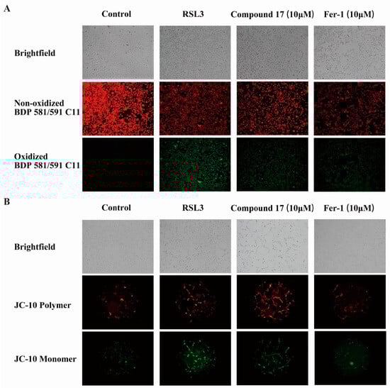 Inhibition of ferroptosis by isobisvertinol (17) through reducing lipid peroxide levels and modulating mitochondrial membrane potential. (A) Determination of lipid peroxidation levels with BODIPY581/591C11 after 17 treatment. (B) Measurement of mitochondrial membrane potential with JC-10 following 17 treatment.