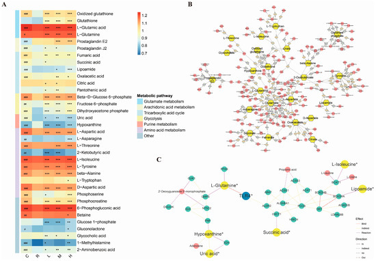 Metabolomic profiling to determine the protective influence of isobisvertinol (17) on ferroptosis. (A) Heatmap of median-scaled metabolite abundances generated via hierarchical clustering, distinguishing Control, RSL3, and 17 (1, 3, 10 μM) + RSL3 groups. Blue and red represent low and high relative metabolite levels, respectively. p-values corrected by Benjamani–Hochberg methods were calculated based on a parametric Student’s t test or a nonparametric Mann–Whitney test. PLS-DA showed separation between experimental groups. (B) Metabolite-reaction interaction network constructed to visualize connections between metabolites and reaction. Yellow nodes represent the differential metabolites detected. Red nodes represent relevant metabolites involved in metabolic reactions. Celadon nodes represent metabolic reactions. (C) Target-metabolite-gene interaction network constructed to visualize connections between genes and metabolites. Blue nodes represent target genes. Green nodes indicate genes potentially involved in metabolism. Red and yellow nodes correspond to those in (B). * p < 0.05, ** p < 0.01, *** p < 0.001 compared with 17 treatment and RSL3 group. # p < 0.05, ## p < 0.01, ### p < 0.001 compared with the control and RSL3 group.
