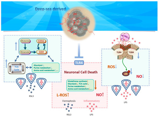 Neuroinflammation and neuronal cell death are leading causes of death in the elderly and underlie various neurodegenerative diseases. These diseases involve complex pathophysiological mechanisms, including inflammatory responses, oxidative stress, and ferroptosis. Compounds derived from deep-sea fungi exhibit low toxicity and potent neuroprotective effects, offering a promising source for drug development. In this study, we isolated 44 natural products from deep-sea-derived fungi and identified isobisvertinol (17) as a compound with anti-inflammatory and ferroptosis-inhibiting effects. Using LPS-induced microglial inflammation and RSL3-induced neuronal ferroptosis models, we found that 17 targets TLR4 to provide neuroprotection. Molecular docking studies revealed that 17 inhibits TLR4 activation by occupying the hydrophobic pocket at the TLR4-MD2 binding site. Additionally, 17 suppresses TLR4, reducing p38 MAPK phosphorylation, and inhibits ferroptosis by decreasing lipid peroxidation and modulating mitochondrial membrane potential. Metabolomic analysis showed that 17 rescues alterations in multiple metabolic pathways induced by RSL3 and increases levels of antioxidant metabolites, including glutamine, glutamate, and glutathione. In summary, our results indicate that isobisvertinol (17) targets TLR4 in neural cells to reduce inflammation and inhibit p38 MAPK phosphorylation, while regulating metabolic pathways, mainly GSH synthesis, to provide antioxidant effects and prevent ferroptosis in neurons.