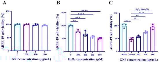 Effect of GNP on the viability of ARPE-19 cells. (A) The effect of GNP on the activity of ARPE-19 cells; (B) The effect of H2O2 stimulation on the activity of ARPE-19 cells; (C) The protective effect of GNP preconditioning on ARPE-19 cells under H2O2 stimulation. Data are shown as mean ± SD (n = 3). p < 0.01 (**), p < 0.001 (***), p < 0.0001 (****) compared with H2O2 alone treated control group.