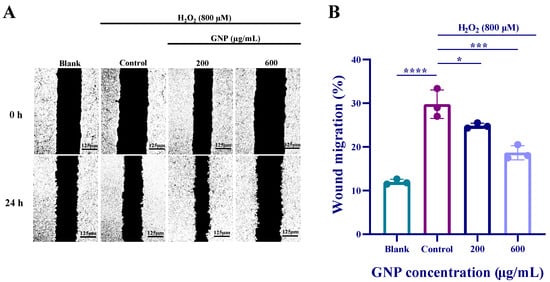ARPE-19 cells were plated in 6-well plates and allowed to adhere for 24 h. Following 24 h exposure to varying concentrations of GNP in serum-free medium, a uniform scratch wound was created in the confluent monolayer using a sterile 200 μL pipette tip. Cells were subsequently treated with H2O2 (800 μM) for 24 h in serum-free medium. The migration of ARPE-19 cells across the wound edge at 0 h and 24 h after the addition of H2O2 was imaged using a microscope (Olympus, Tokyo, Japan). The formula to calculate healing rate is
