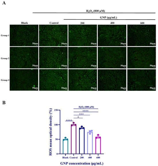ARPE-19 cells were seeded in 24-well plates and treated with GNP at concentrations of 200, 400, and 600 μg/mL. After 24 h of incubation, cells were exposed to 800 μM H2O2 for 24 h. Subsequently, 10 μM DCFH-DA was added to each well and incubated in the dark at 37 °C for 30 min. Following two washes with PBS, intracellular ROS generation was visualized and imaged using a fluorescence microscope (Olympus, Tokyo, Japan).