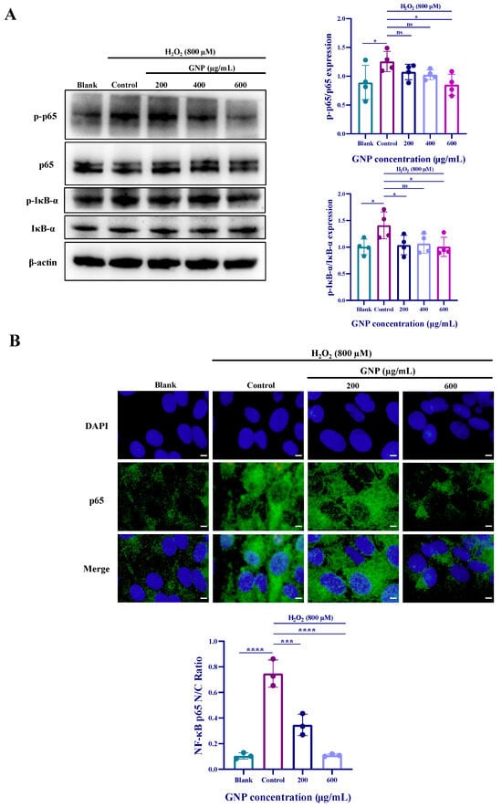 Compared to untreated control groups, H2O2 stimulation of ARPE-19 cells led to increased expression of p-p65 and p-iκB-α. However, treatment with GNP at concentrations of 200, 400, and 600 μg/mL resulted in reduced phosphorylation levels of p65 and iκB-α (Figure 4A). To further validate the effect of GNP on the NF-κB signaling pathway, immunofluorescence experiments were conducted (Figure 4B). The results demonstrated that H2O2 stimulation caused translocation of p65 into the nucleus in ARPE-19 cells. However, after 24 h of GNP treatment, nuclear p65 levels decreased in a dose-dependent manner. These findings indicate that GNP exerts an inhibitory effect on the NF-κB pathway.