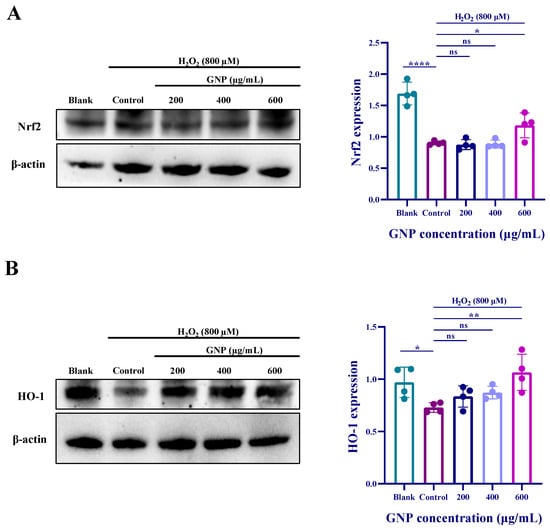 ARPE-19 cells were treated with GNP (200, 400, and 600 μg/mL, 24 h), followed by exposure to H2O2 (800 μM). After 24 h incubation, cells were washed with PBS and lysed using RIPA buffer supplemented with PMSF (100:1). Protein concentrations were determined by BCA assay. Subsequently, proteins were separated by SDS-PAGE and transferred onto nitrocellulose (NC) membranes. The membranes were blocked with 7% skim milk for 2 h at room temperature, then incubated overnight at 4 °C with primary antibodies (mouse anti-antibody at 1:500 dilution; rabbit anti-antibody at 1:1000 dilution). After washing, membranes were incubated with corresponding HRP-conjugated secondary antibodies (anti-mouse at 1:1000; anti-rabbit at 1:2000) at room temperature (2 h). Protein expression levels were finally visualized using an ECL detection system (Syngene, Cambridge, UK).