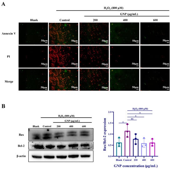 Cell damage is often accompanied by apoptosis, and Annexin V is one of the sensitive indicators for detecting early apoptosis, labeled with green fluorescence (FITC). Propidium Iodide (PI), a nucleic acid dye, stains cell nuclei during the mid-to-late stages of apoptosis and necrotic cells. The staining results can be detected using fluorescence microscopy or flow cytometry, as shown in Figure 6A. Compared to the blank group, the H2O2-treated group exhibited significantly increased red and green fluorescence, indicating severe apoptosis progressing into the late stage. After treatment with GNP, fluorescence intensity decreased, with the most notable reduction observed in the GNP-treated group at a concentration of 600 μg/mL. Western blot analysis of apoptosis-related protein expression (Figure 6B) showed that compared to the blank group, the control group exhibited reduced Bcl-2 protein expression and increased Bax protein expression. Compared to the control group, ARPE-19 cells treated with GNP displayed elevated Bcl-2 expression and decreased Bax expression, with these changes being dose-dependent.