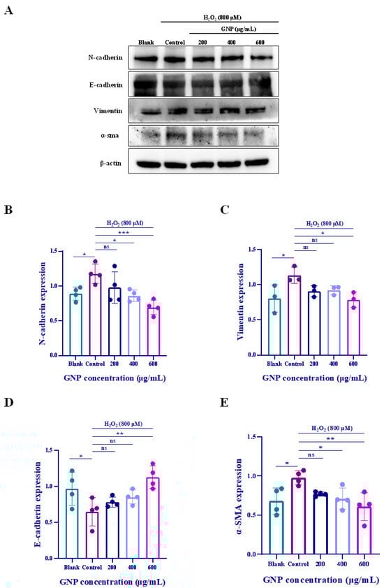 EMT is a process by which epithelial cells undergo transformation into mesenchymal phenotypes, strongly associated with OS. During EMT, epithelial cells lose their apical-basal polarity and cell–cell adhesion properties while acquiring mesenchymal characteristics, including enhanced motility, invasiveness and resistance to apoptosis. This process is characterized by upregulation of mesenchymal markers such as vimentin (Vim), N-cadherin (N-cad) and α-smooth muscle actin (α-SMA), accompanied by downregulation of epithelial markers E-cadherin (E-cad), ultimately leading to increased invasiveness, metastatic dissemination, cancer stemness, and chemoresistance [49]. EMT plays a significant role in various ocular degenerative diseases, including AMD. In this study, the results showed that GNP promoted E-cadherin levels and inhibited the expression of N-cadherin, Vimentin, α-SMA, and controlled the migration and proliferation of ARPE-19 cells (Figure 7). E-cadherin serves as a key adhesion structure between epithelial cells, providing strong and stable intercellular connections. In contrast, N-cadherin, which is predominantly expressed in mesenchymal cells, confers weaker and more dynamic adhesion capabilities. Meanwhile, vimentin offers mechanical protection to migrating cancer cells against stresses encountered during migration or spatial confinement, and is also widely recognized as a critical marker of EMT [36]. Furthermore, wound healing assays demonstrated that GNP inhibited H2O2-induced cell migration (Figure 2), indicating that GNP effectively suppresses EMT triggered by oxidative stress.