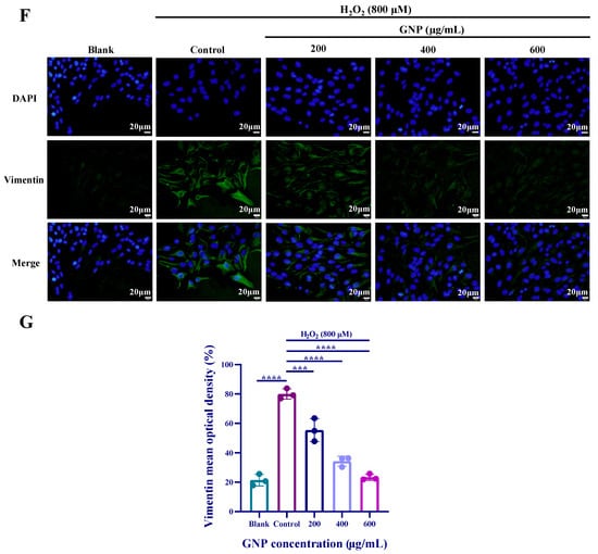 After treatment with GNP (200, 400, and 600 μg/mL, 24 h), cells were exposed to H2O2 (800 μM, 24 h) and then removed from the incubator for subsequent experiments. The old medium was aspirated, and cells were fixed with 4% paraformaldehyde (4 °C, 30 min), followed by permeabilization with 0.2% Triton X-100 (4 °C, 10 min). After washing three times with PBS, cells were blocked with 5% bovine serum at room temperature (1 h). Subsequently, cells were incubated overnight with primary antibodies against NF-κB p65 or Vimentin diluted in 1% bovine serum. Following PBS washes, cells were incubated with Incubate goat anti-mouse IgG Dylight 488 (1:500) or anti-rabbit IgG Dylight 488 (1:500) in the dark (2 h), counterstained with DAPI (10 min), and imaged using an inverted fluorescence microscope (Olympus, Tokyo, Japan).