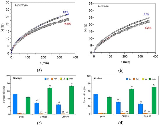 Dynamics of the hydrolysis degree of squid pens using Novozym (a) and Alcalase (b) at 0.25% and 0.5% concentrations and chemical composition of the initial pens and the chitins obtained after 6 h of hydrolysis with Novozym (c) and Alcalase (d) using 0.25% (CHN25 and CHA25) and 0.5% (CHN50 and CHA50) of the respective proteases. Experimental data were fitted to the Weibull equation [16]. Different letters (a, b) indicate significant differences (p < 0.05) between protease concentrations within the same enzyme treatment (CHN25 vs. CHN50, and CHA25 vs. CHA50). Different numbers (1, 2) denote significant differences (p < 0.05) between enzymatic hydrolysis at the same concentration (CHN25 vs. CHA25, and CHN50 vs. CHA50).