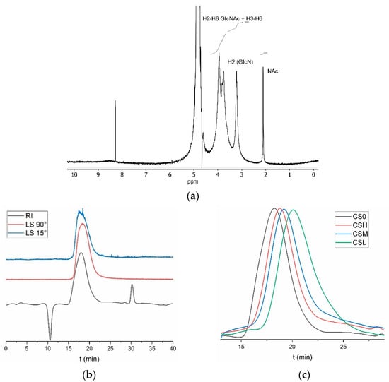 1H NMR spectrum of chitosan (CS0) in 0.056M d-TFA in D2O at 400 MHz. GlcN: glucosamine, GlcNAc: N-acetylglucosamine, and NAc: N-acetyl. Deacetylation degree 91.5% (a). GPC eluogram of CS0 (black line: refractive index detector; red line: right angle light scattering detector; blue line: low angle light scattering detector (b). GPC eluograms of chitosan depolymerization (refractive index detector) (c).