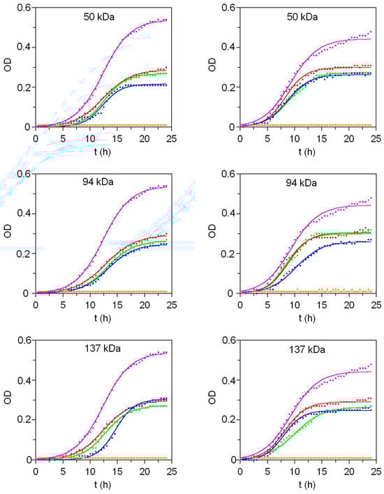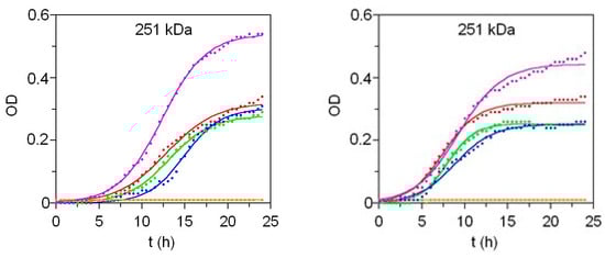 The antimicrobial activity of β-chitosan with different molecular weights was evaluated against vegetative cells of Escherichia coli and Bacillus cereus, two common foodborne bacterial species, by monitoring the planktonic growth of these microorganisms in the presence of different β-chitosan concentrations. Bacterial growth kinetics were analyzed based on optical density (OD) at 600 nm (Figure 3). Experimental data were fitted to the logistic growth model [1] (Table S5), and the numerical values of the corresponding parameters are reported in Tables S7 and S8 (Supplementary Materials). In this study, OD was used as the dependent variable instead of biomass (X), as specified in the logistic equation from Table S5. The key parameters of this mathematical model include ODm (maximum optical density), νOD (maximum optical density rate), and λOD (lag phase of the optical density).