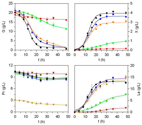The experimental dynamic data on bacterial growth, nutrient consumption, and lactic acid production were simulated using an unstructured mathematical model, as summarized in Equations [1–6] and detailed in Tables S5 and S6 (Supplementary Materials) [25].