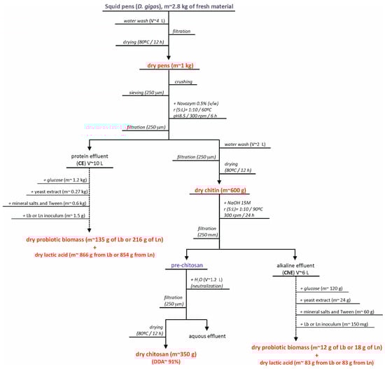 Flowchart of chitosan balance mass produced on optimal conditions, including the production of human probiotics using the residual effluents generated in the deproteinization and deacetylation stages, for 1 kg of initial by-product (pens of Dosidicus gigas).