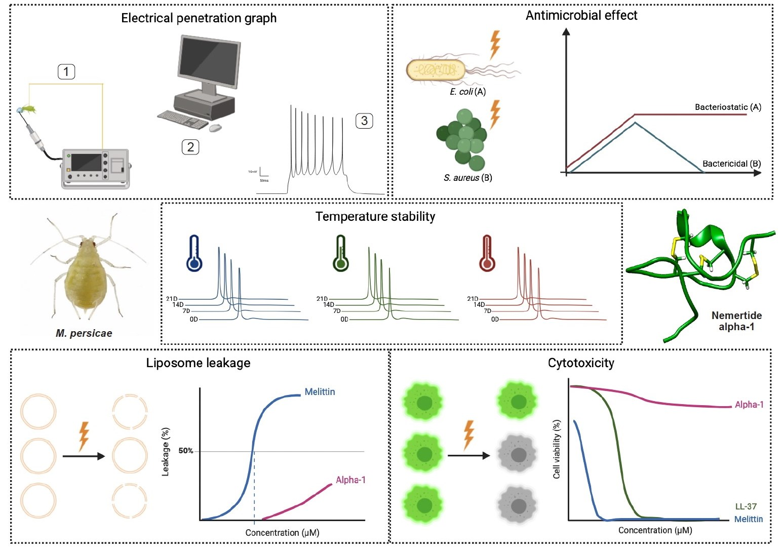 Laborde, Q.; Dancewicz, K.; Jacobsson, E.; Strömstedt, A.A.; Muhammad, T.; Eriksson, C.; Slazak, B.; Göransson, U.; Andersson, H.S. Nemertide Alpha-1 as a Biopesticide: Aphid Deterrence, Antimicrobial Activity, and Safety Aspects. Mar. Drugs 2025, 23, 388. https://doi.org/10.3390/md23100388