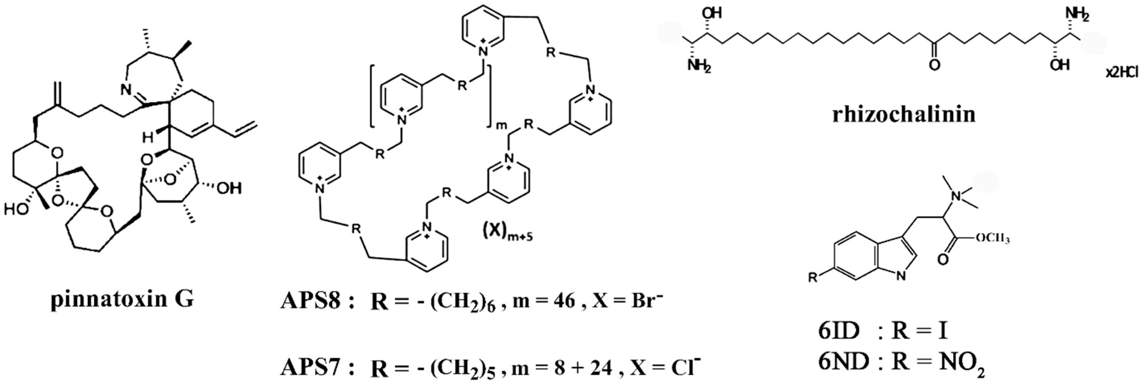 pinnatoxin G | muscle-type, α4β2, α7 nAChRs | LN18, U87, U373 glioma cells, MDA-MB-231 breast cancer, PC3 prostate cancer, HT29 colon cancer cells | decreased cell viability | [50] |