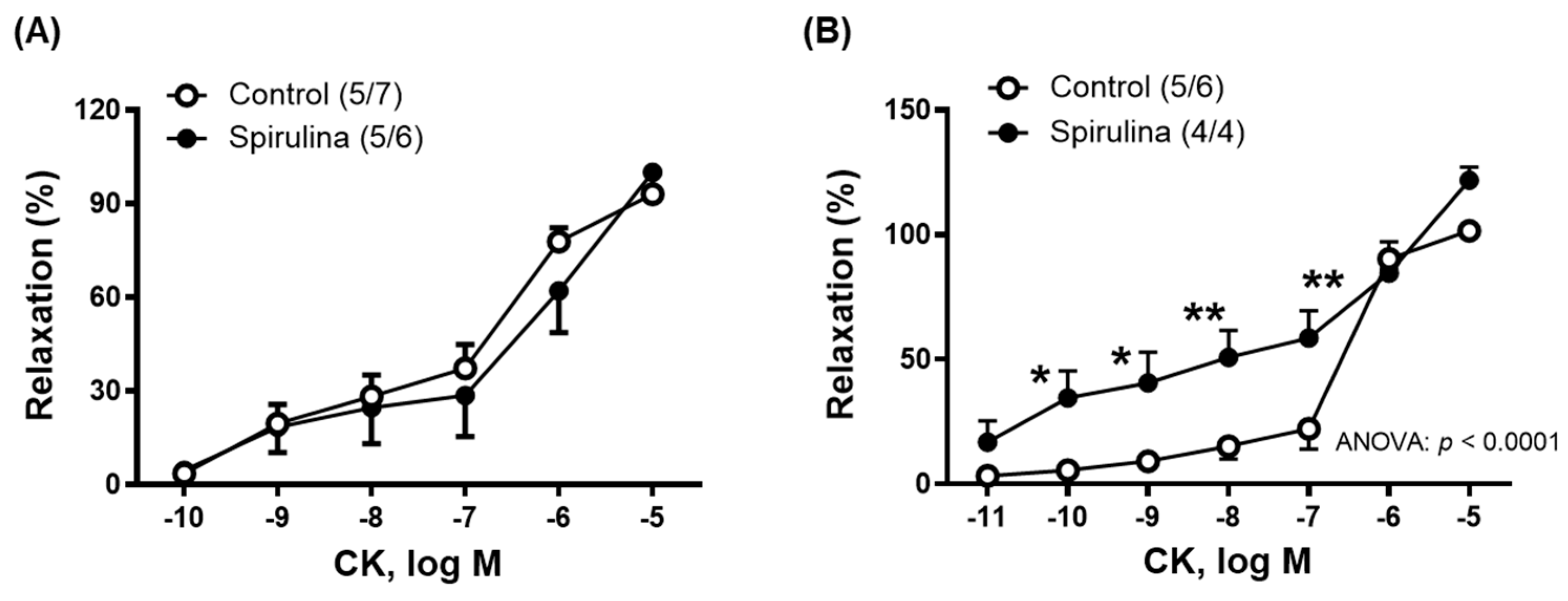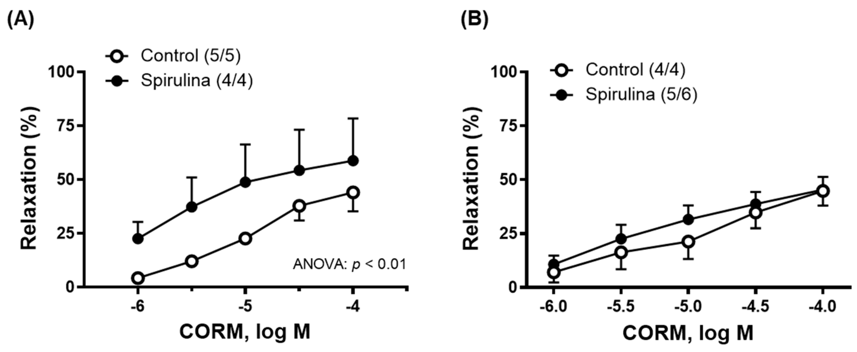 - Villalpando, D.M.; Verdasco-Martín, C.M.; Plaza, I.; Gómez-Rivas, J.; R de Bethencourt, F.; Villarroel, M.; García, J.L.; Otero, C.; Ferrer, M. Beneficial Effects of Spirulina Aqueous Extract on Vasodilator Function of Arteries from Hypertensive Rats. Int. J. Vasc. Med. 2020, 2020, 6657077. [Google Scholar] [CrossRef] [PubMed]