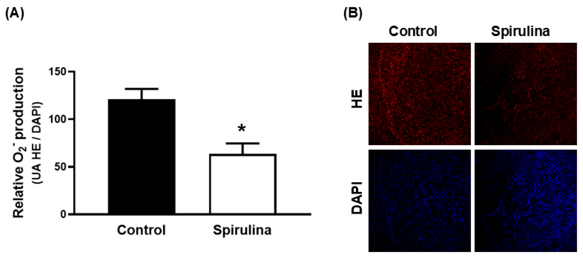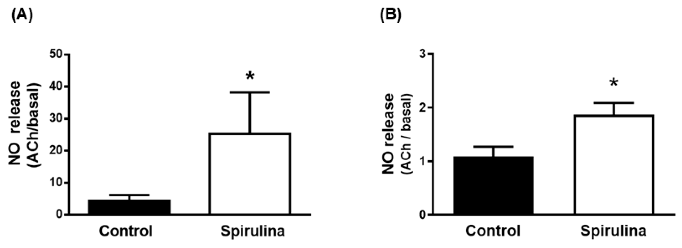 - de Freitas Brito, A.; Silva, A.S.; de Souza, A.A.; Ferreira, P.B.; de Souza, I.L.L.; da Cunha Araujo, L.C.; da Silva, F.G.; de Souza Sampaio, R.; da Conceição Correia, S.M.; Tavares, R.L.; et al. Supplementation with Spirulina platensis Modulates Aortic Vascular Reactivity through Nitric Oxide and Antioxidant Activity. Oxidative Med. Cell. Longev. 2019, 2019, 7838149. [Google Scholar] [CrossRef]
