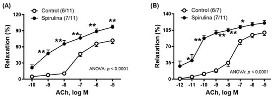 Effect of the Enz-Spir-E (0.1% w/v) on the vasodilator response induced by acetylcholine (ACh). Effect of the spirulina enzymatic extract incubation on the concentration–response curve to Ach in aortic (A) and mesenteric (B) arterial segments from aged SD rats. Results (means ± SEM) are represented as the percentage of inhibition of the contraction elicited by 0.1 µM noradrenaline (aorta: 67.4 ± 3.1% in control and 60.9 ± 5.6% in spirulina group; p > 0.05) and 1 µM noradrenaline (mesenteric arteries: 70.8 ± 4.3% in control and 93.1 ± 5.6% in spirulina group; p < 0.05). Number of animals and arterial segments are indicated in parentheses. The statistical significances are indicated in the corresponding graphs. * p < 0.05; ** p < 0.01 compared to control condition. (C) Representative portions of the original recording of aortic segments showing the effect of Enz-Spir-E on the concentration–response curve to ACh. Note that Enz-Spir-E incubation was initiated after checking vascular functional integrity (through KCl-induced response) and endothelium functionality (through ACh-induced vasodilation in NA-precontracted segments). Individual experimental data points are included in the Supplementary Materials.
