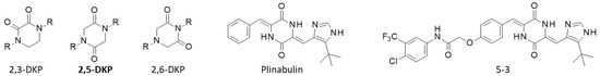 The diketopiperazine (DKP) motif is frequently encountered in drugs and natural products. There are three DKP isomers: 2,3-, 2,5-, and 2,6-DKPs (Figure 1). The 2,5-DKP motif is the one most commonly found in natural products, but the two other configurations are also exploited for drug design. For example, a recent work explored 2,3-DKP as a potential scaffold for developing antiparasitic compounds to combat Chagas disease [1]. The motif can be encountered occasionally in natural products, such as the alkaloids heterpyrazines A-B [2] and orychophragvioline A [3]. The 2,6-DKP unit is not very common, but it has been explored for designing anticonvulsant, anticancer, and antiparasitic compounds, for example [4,5,6,7,8,9]. In contrast, 2,5-DKPs are largely represented in nature, as observed in various alkaloids such as brevianamides E1-E2, amauromine, naseseazines, and many other natural products [10,11]. The drug candidate plinabulin is a 2,5-DKP derivative acting as an anti-tubulin agent, currently undergoing phase 3 clinical trials for the treatment of non-small-cell lung cancer [12,13], and its derivative 5-3 has revealed a promising antileukemic activity [14] (Figure 1). The DKP motif is considered important to the design of anticancer agents [15].