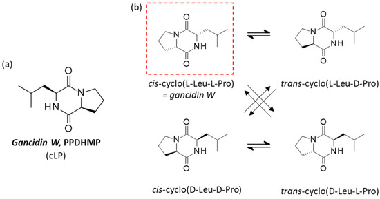 (a) Structure of gancidin W and (b) the different isomers of cyclo(Leu-Pro). Gancidin W corresponds to cis-cyclo(L-Leu-L-Pro) [cLP] or PPDHMP, (3S,8AR)-3-isobutylhexahydropyrrolo[1,2-a]pyrazine-1,4-dione.